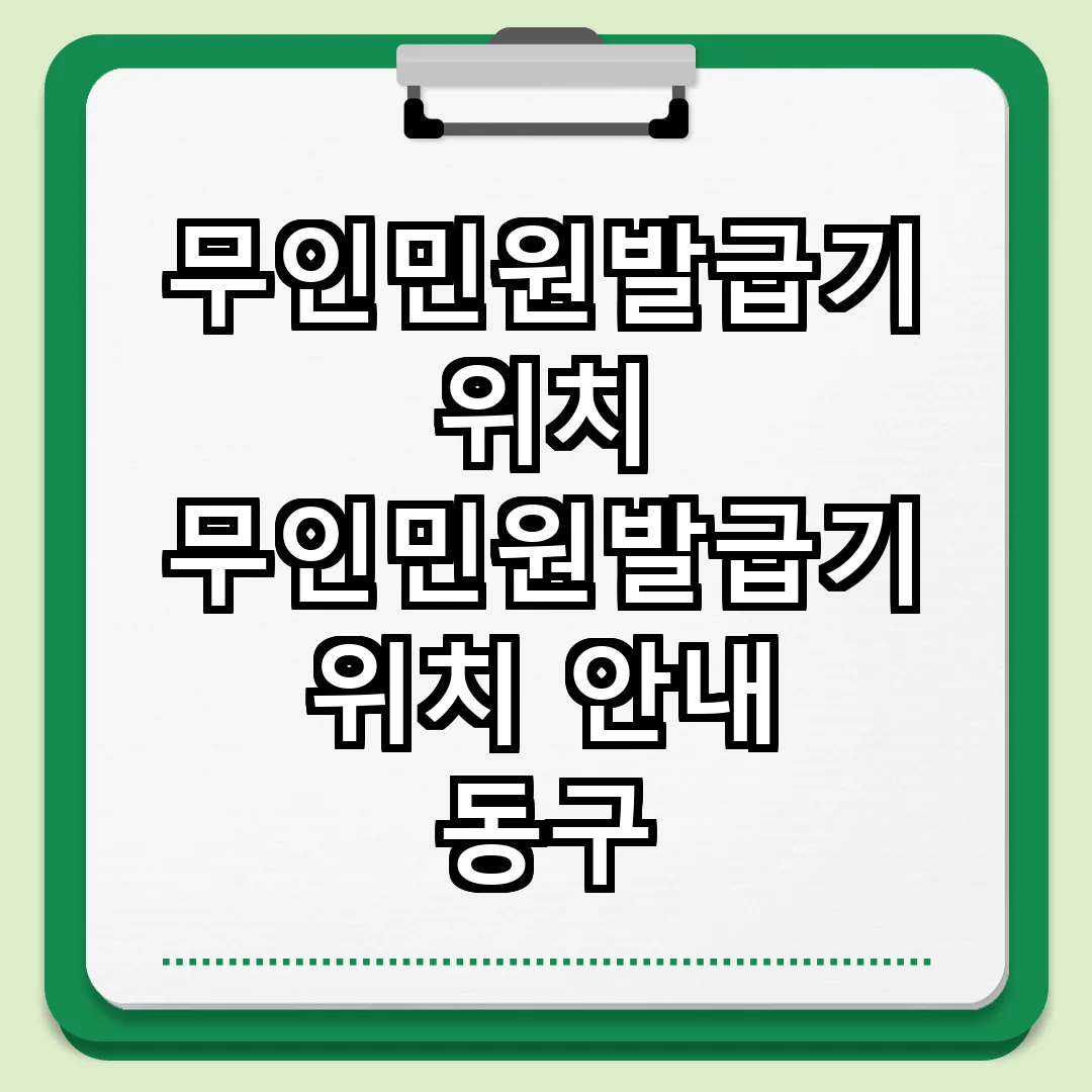 동구 내 다양한 서류를 편리하게 발급받을 수 있는 무인민원발급기 정보를 활용하여, 필요할 때 신속하게 민원을 처리하세요. 무인민원발급기를 통해 보다 효율적인 행정 서비스를 경험할 수 있습니다.