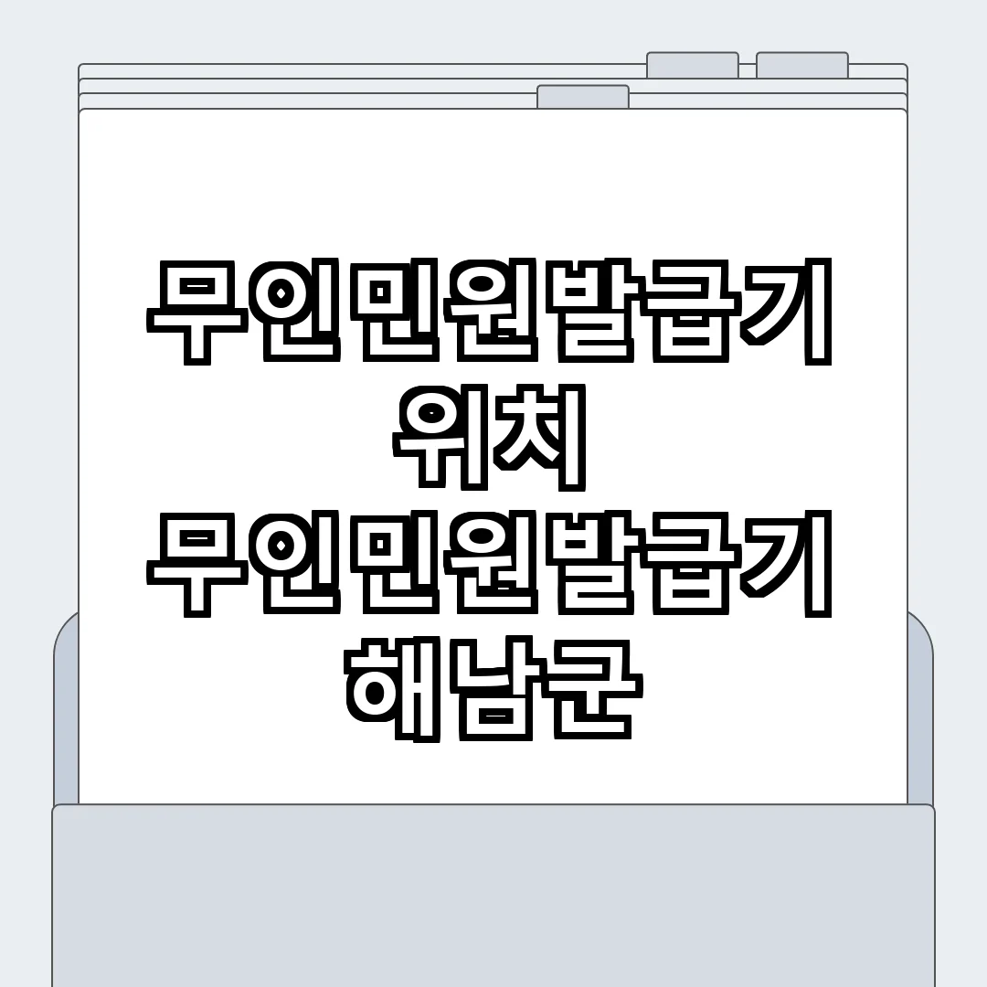 해남군에는 여러 곳에 무인민원발급기가 설치되어 있어 주민들이 편리하게 이용할 수 있습니다. 보통 해남군청이나 주요 공공기관 근처에 위치하고 있으며, 각 기계는 다양한 공공서류를 발급할 수 있는 기능을 갖추고 있습니다. 사용자는 기계 화면의 안내에 따라 필요한 서류를 선택하고, 신분증을 스캔한 후 원하는 서류를 발급받을 수 있습니다. 아래는 무인민원발급기를 이용하기 위한 준비물 리스트입니다: